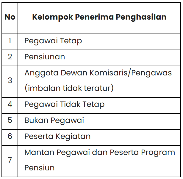 Penerima penghasilan yang dikenakan PPh Pasal 21 merupakan individu wajib pajak dalam negeri dengan penghasilan dari pekerjaan atau jasa. Peraturan Menteri Keuangan Nomor 168 Tahun 2023 menetapkan klasifikasi subjek pajak ini ke dalam beberapa kelompok utama. Berikut adalah rincian kelompok tersebut: